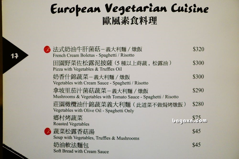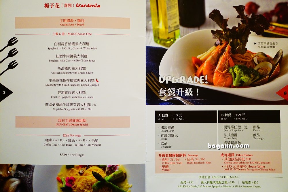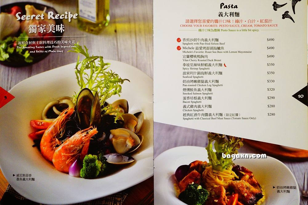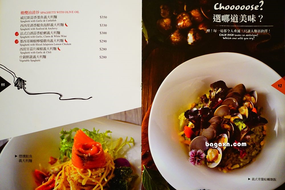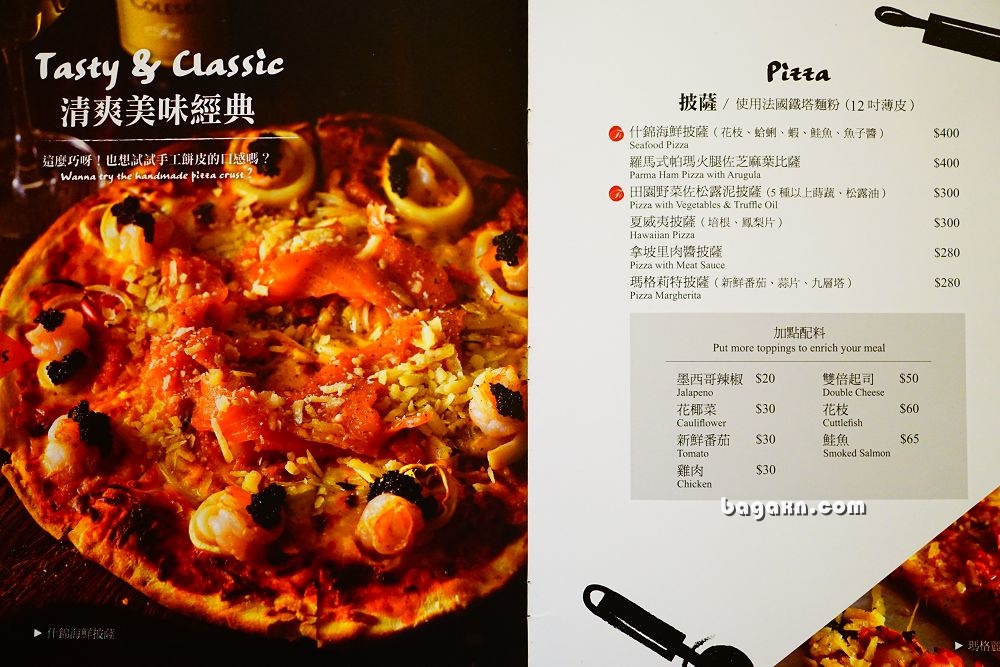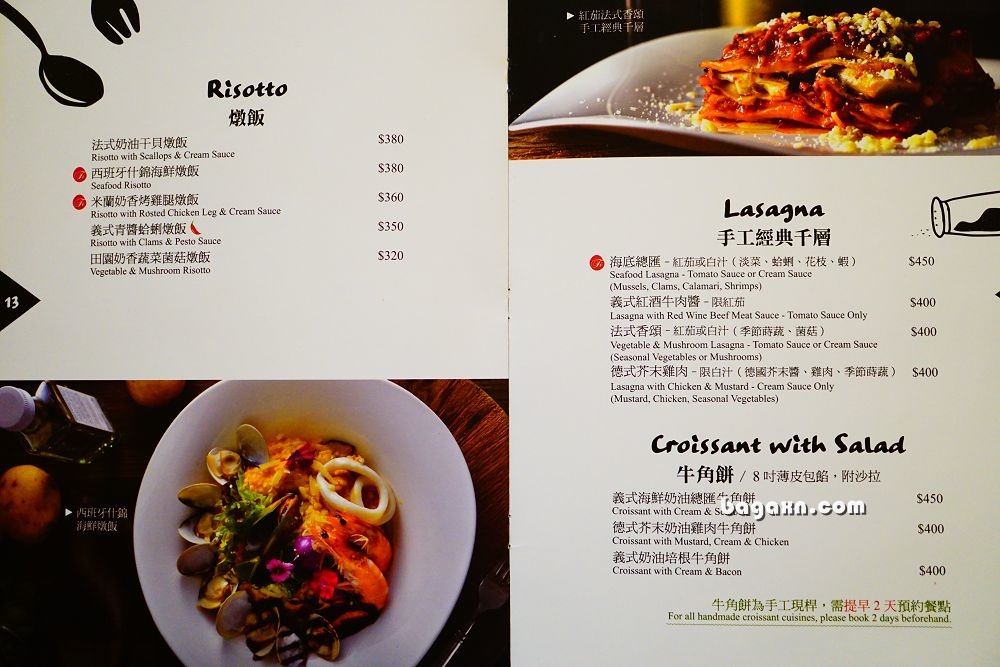 餐點有義大利麵、燉飯、Pizza、千層麵等主食可以選擇,單點或是加價升級為套餐都可以。喜愛牛排的朋友,這裡也有牛排套餐可以選擇,我們這次也點了一份,下文會在詳述分享內容。素食者另有歐風素食料理可做選擇,詳細菜單如下,或是可點選連結至店家官方網站查看。