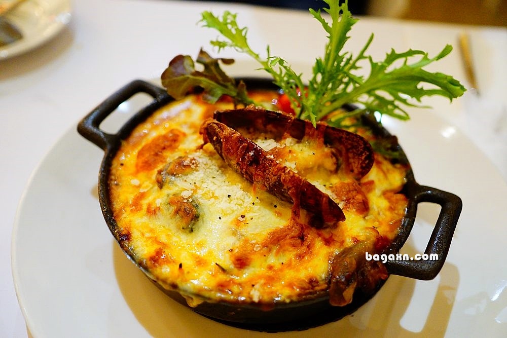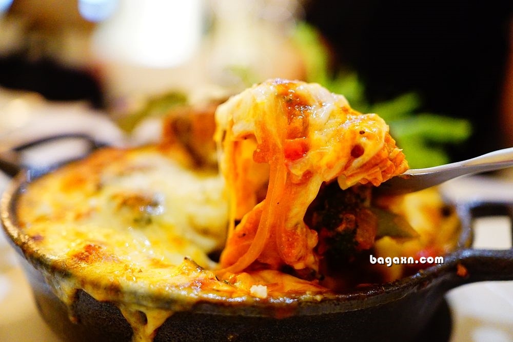 最上層是一層厚實的焗烤,隨著刀叉一翻便是滿滿的牽絲感~內容物除了千層麵之外,還有淡菜、蛤蜊、花枝、蝦子等食材,料多豐盛超滿足!