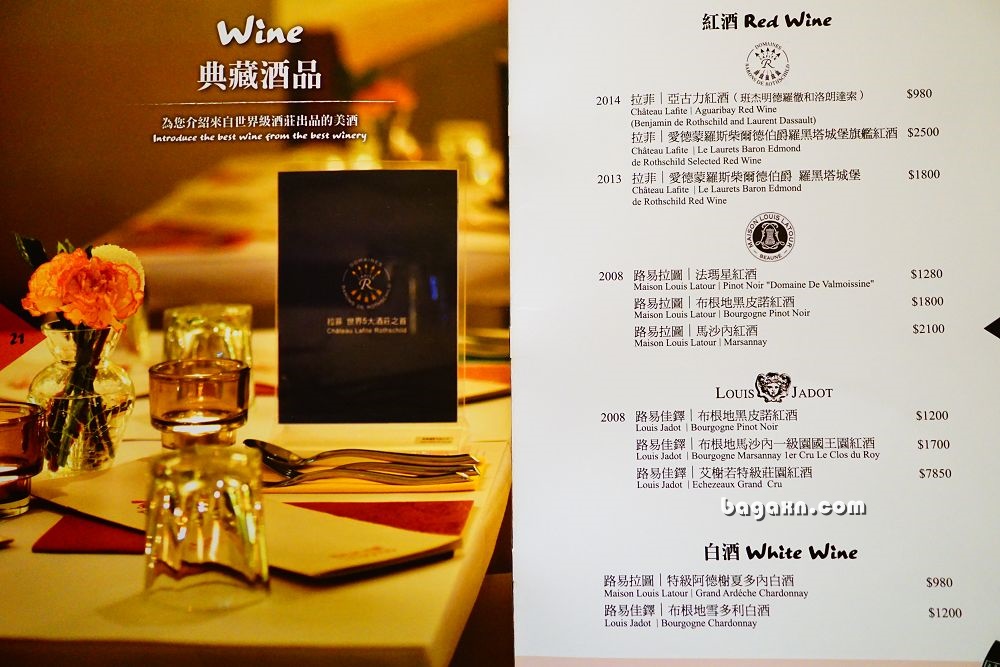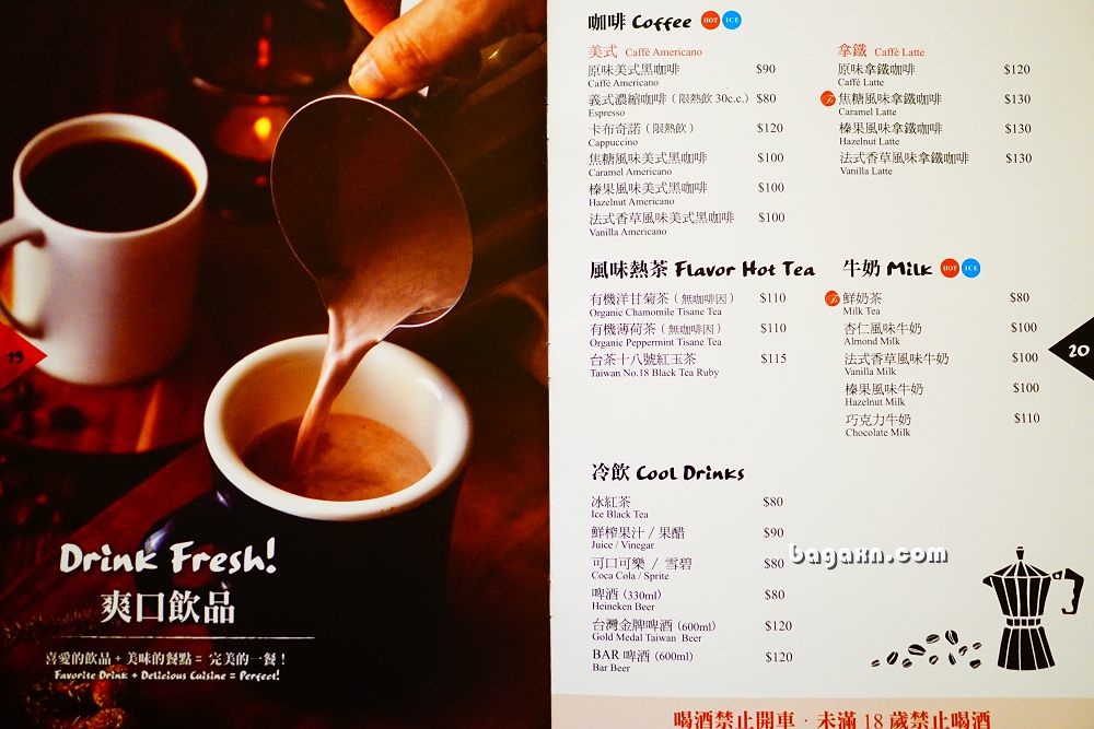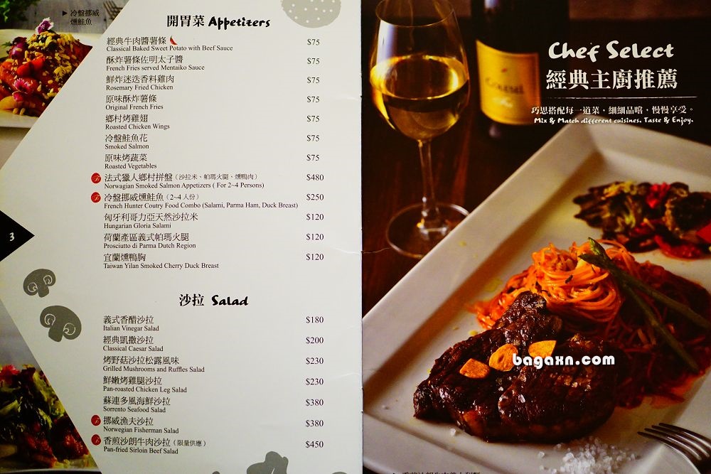 另外還有多款開胃菜、沙拉可以點購,飲品則有咖啡、熱茶、冷飲、紅酒、白酒……等多種選項。每人低消為至少一份商品,消費均需加收10%服務費。