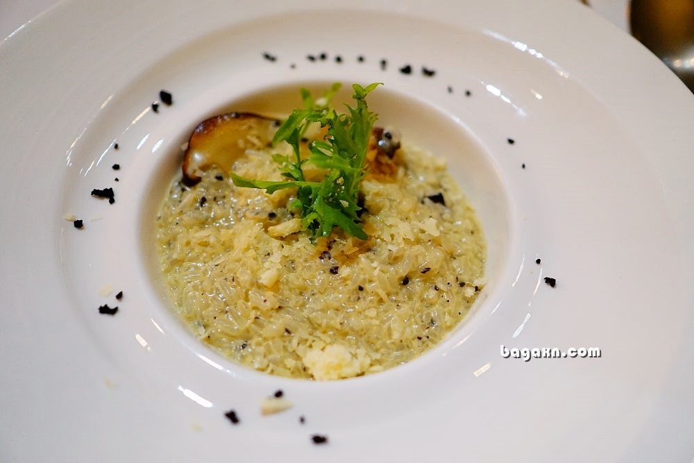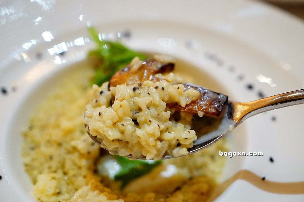 燉飯選用的是台灣長米,有濃郁的松露香氣,淡淡的奶香味不會過於濃厚,裡面還有不少菇類。米飯入味卻不軟爛,嘗得到顆粒分明的口感,這滋味及口感是令人停不下湯匙的一道燉飯。