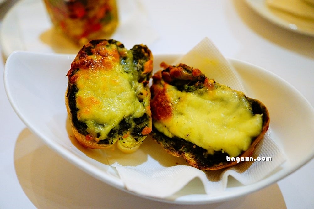 這道也是套餐均附的,青醬是由摩洛哥鯷魚+九層塔打成的,紮實的抹在麵包上,加上起司去做焗烤。吃起來外酥又帶有香濃起司香及青醬的清香味,味道極佳!