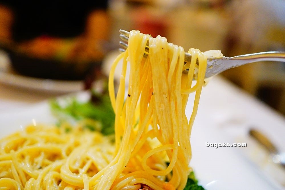 深盤藏住了份量多多的義大利麵,奶油白醬口味要做得好吃真的不容易,增一分太奶、減一分太淡,奶香濃郁卻又不會感到膩口,滋味恰到好處。