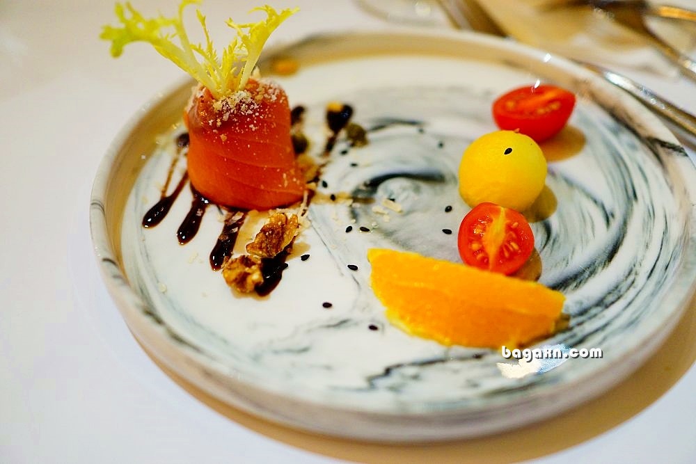 這道是牡丹套餐附的冷盤鮭魚花,以小番茄、香瓜、柳丁加以點綴,如同藝術般令人捨不得吃。