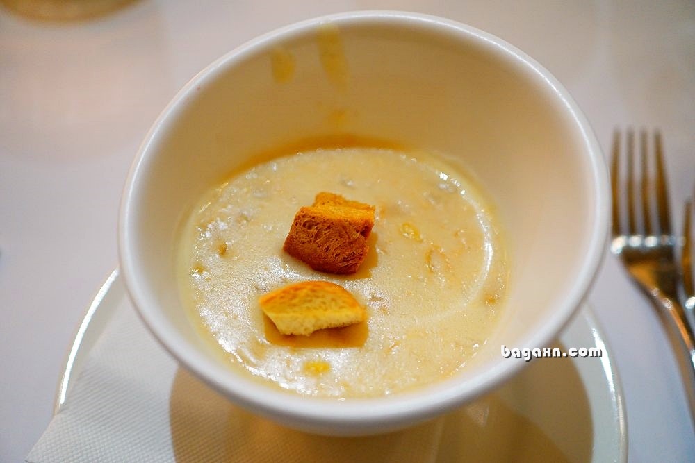 三份套餐均附「主廚濃湯」,這款是雞絲玉米濃湯,看起來好像很普通,其實熬製的功夫可不小。雞肉低溫慢火烤2小時至外皮酥脆,放入高湯再慢火燉個4小時,小小一碗濃湯要耗費不少熬煮時間。