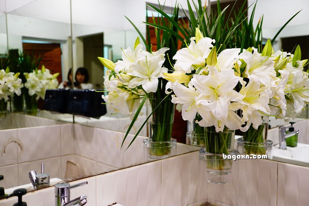 洗手間放上了綻放的香水百合,令人備感清新舒適。
