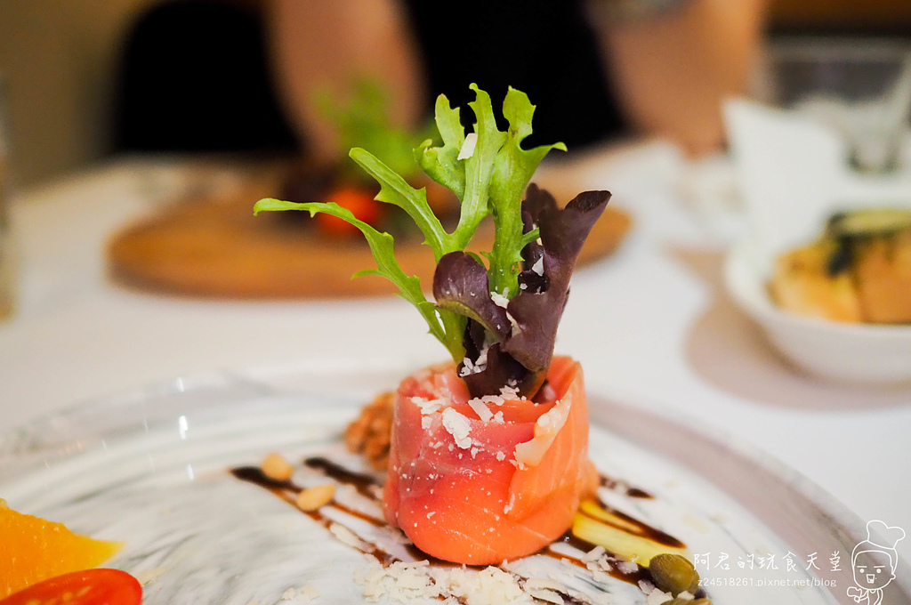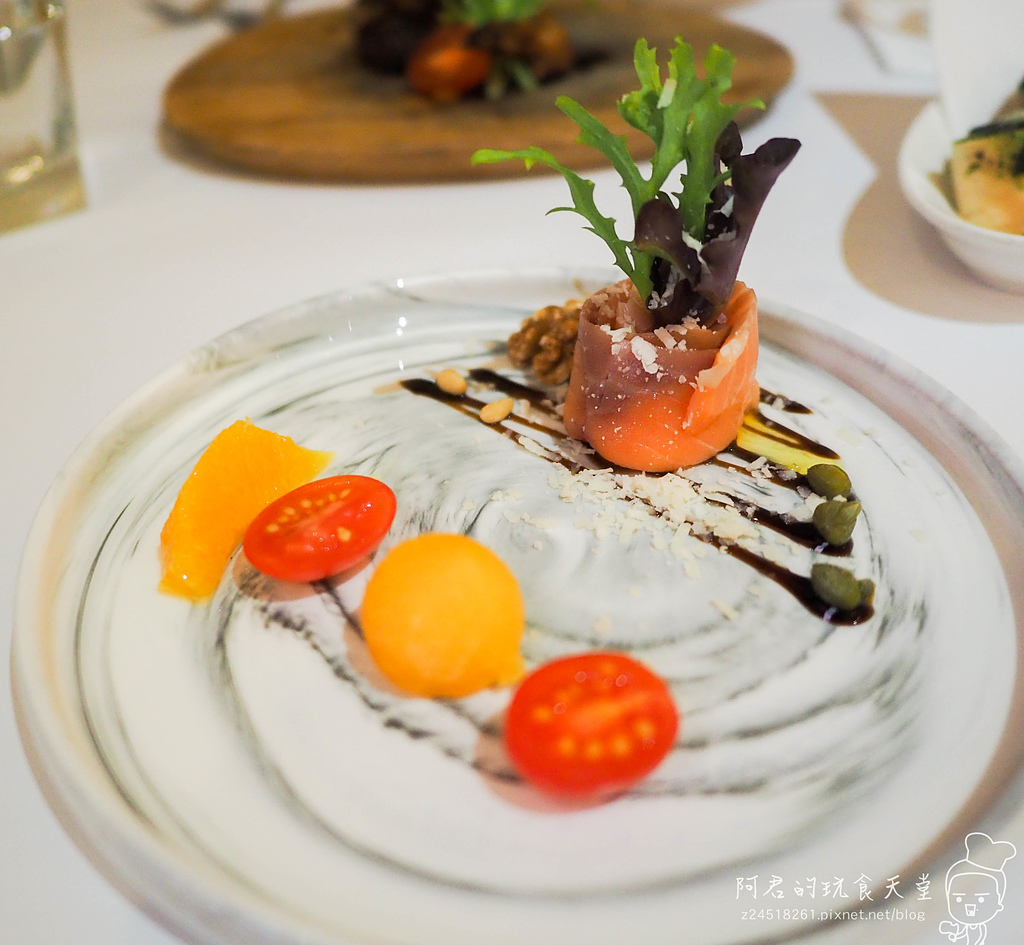 冷前菜,使用了北極的野生鮭魚加上生菜,淋上了義大利進口的巴薩米克醋,鮭魚本身並沒有過多的調味,感想的話…就僅有鮮甜兩字可以形容吧。