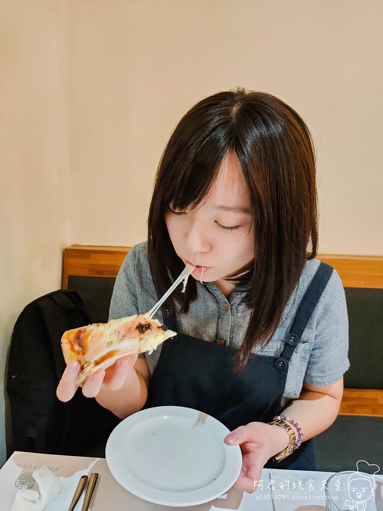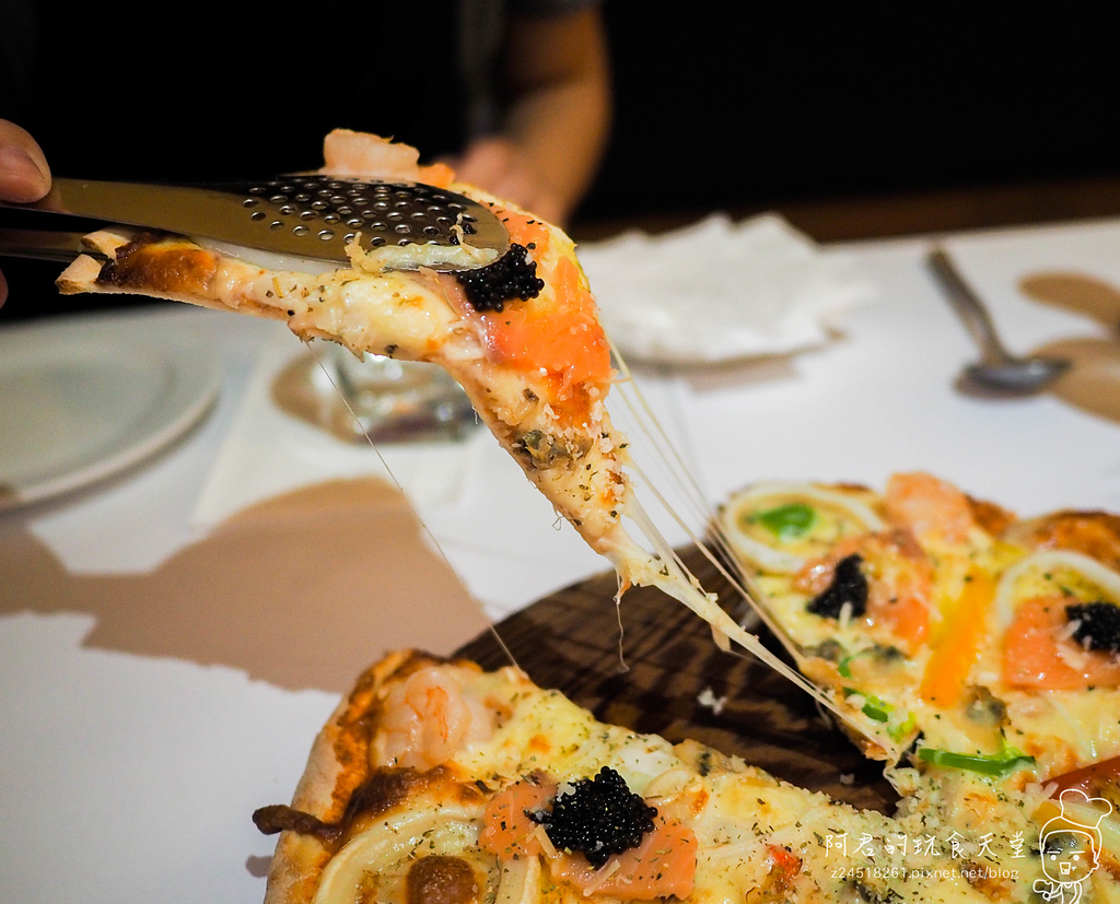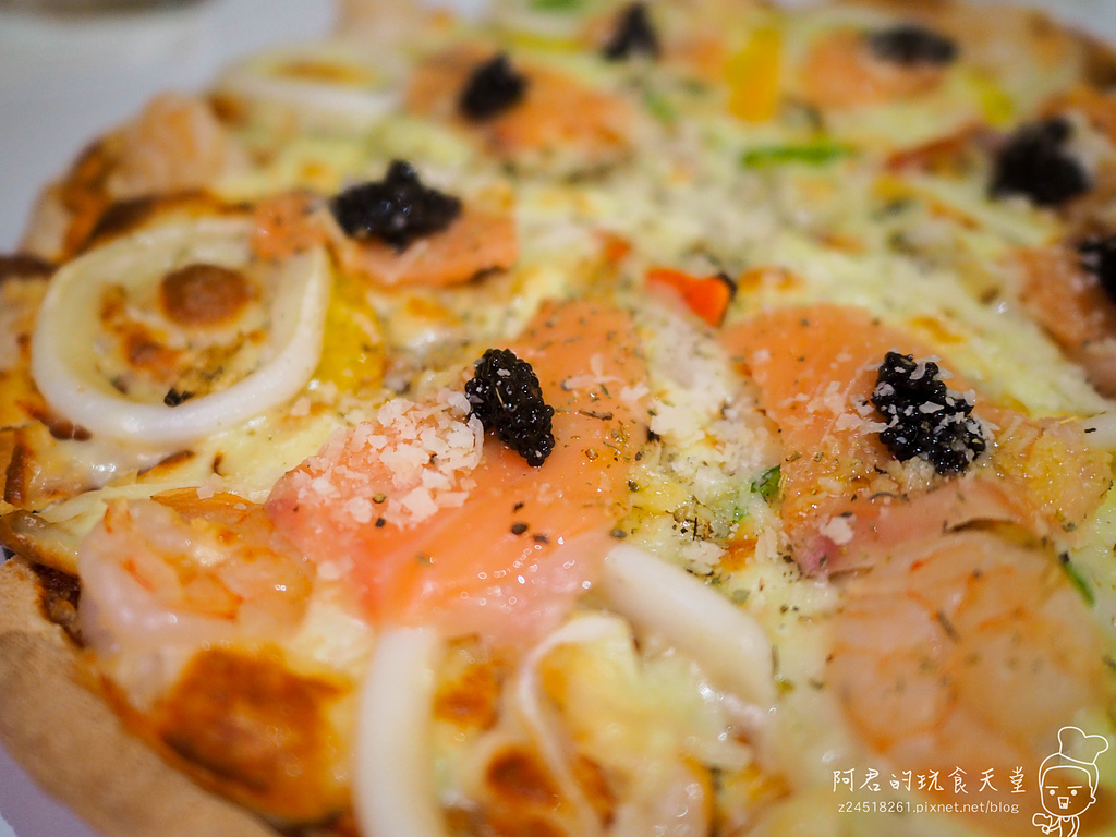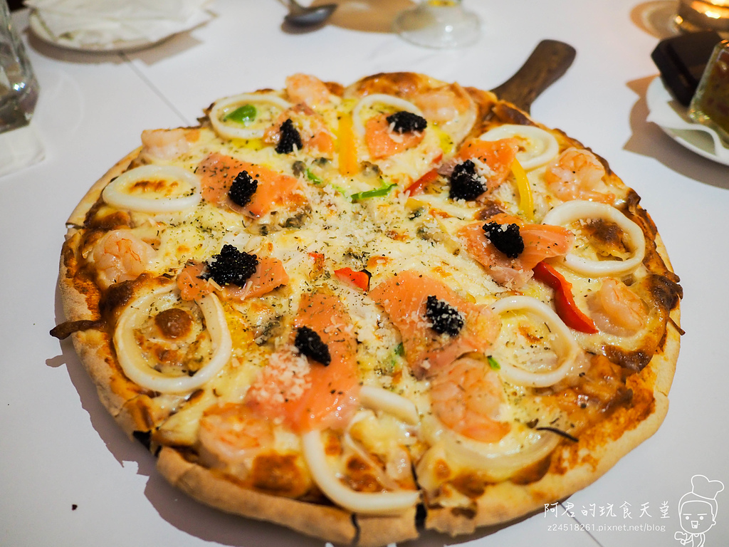 使用了法國進口的麵粉,手工擀皮,這個是屬於薄皮披薩,外層的部份吃起來爽脆,中間則是比較Q軟的口感,上頭放上了蝦子、中卷、煙燻鮭魚跟魚子醬,…最後吃不完還打包回家當早餐了。