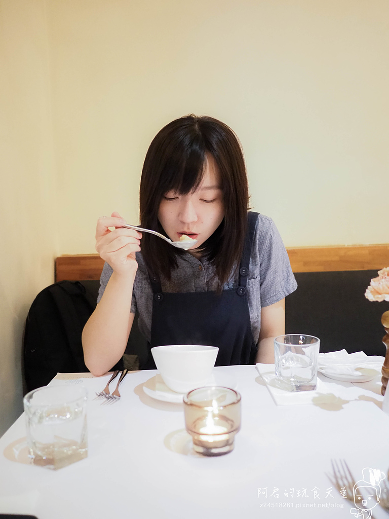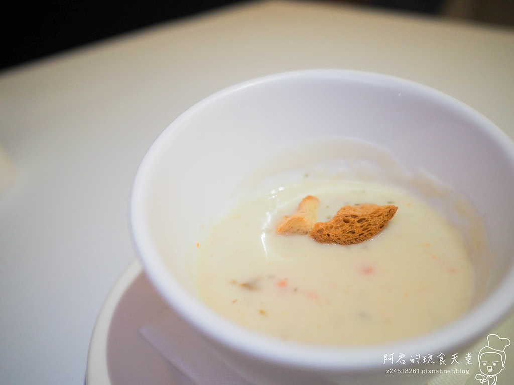 一開始先上的是主廚濃湯「雞絲濃湯」,是用老母雞燉煮而成,除了可以每一口都吃到一絲絲的雞肉外,濃郁的奶香味、甘醇的雞湯,兩者完美的融合,光是第一道湯就足以讓人驚豔。