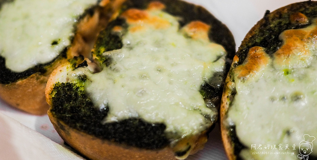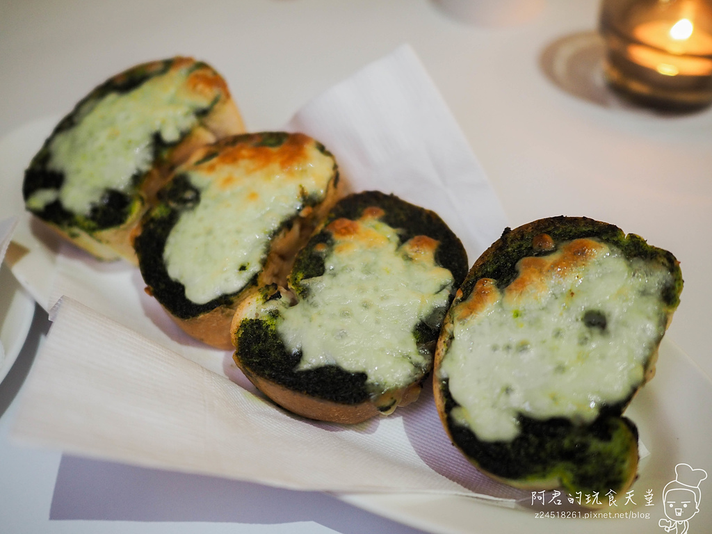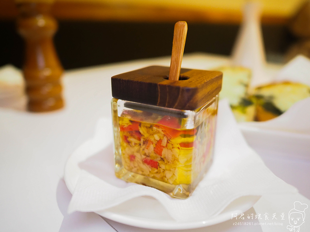 青醬焗烤麵包,酥脆的軟法搭配上自製青醬,非常的美味,這時候店家還掏出了他們的秘密武器,「自製辣椒油」,使用了橄欖油、大蒜跟青龍椒,沾著麵包吃相當開胃。