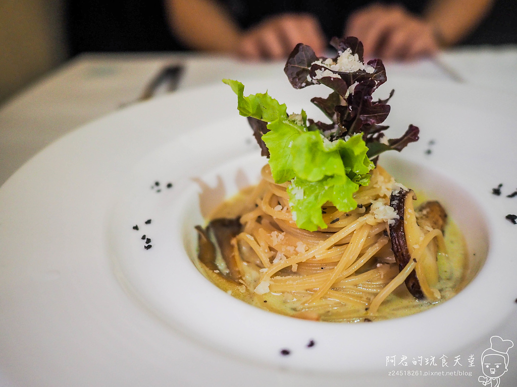 義大利最負盛名的松露產地就是阿爾巴,算是國際間知名的頂級松露品牌。而熱前菜,就是使用義大利阿爾巴黑松露拌炒的義大利麵,麵本身也是使用義大利進口的麵條,再加上松露醬快速拌炒後收汁,所以吃起來松露味相當的厚重。