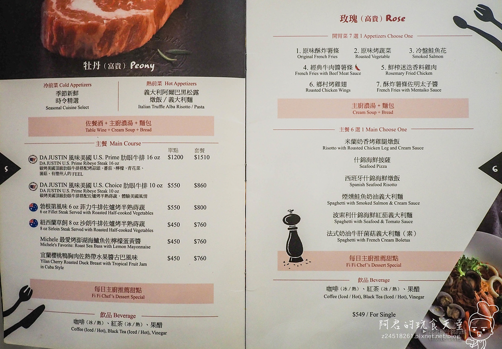 今天吃的是玫瑰套餐($549),以及牡丹套餐中的DA JUSTIN 風味美國 U.S. Prime 肋眼牛排16oz ($1510)。