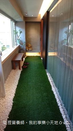 出電梯要進入門口時,映入眼簾的是一條鋪有草皮的通道,旁邊佈滿了白色小石頭,