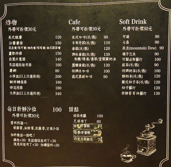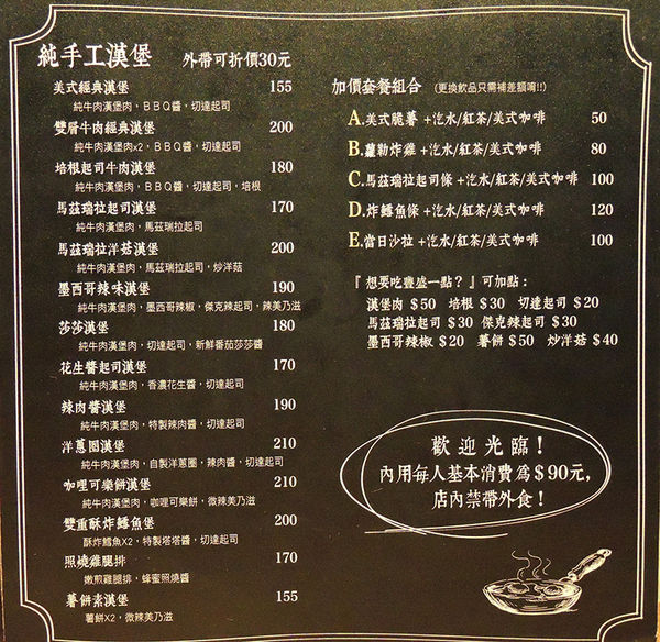 店內禁帶外食,內用每人基本消費為$90,任何商品外帶都可折價$30元
