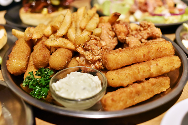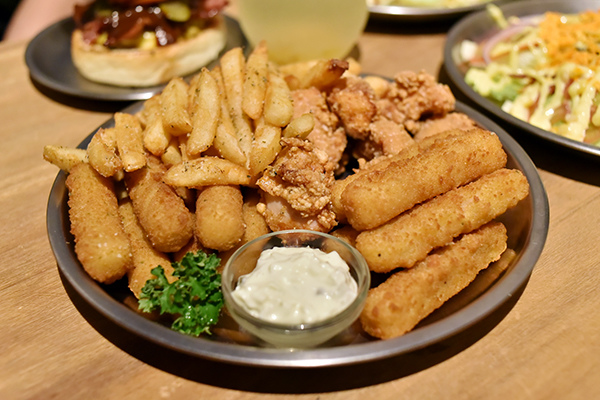 美式脆薯、蘿勒炸雞、馬茲瑞拉起司條、酥炸鱈魚條、塔塔醬