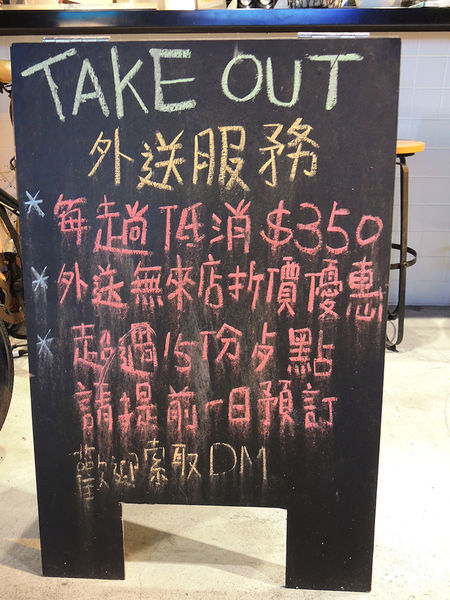 Take Out 外送服務每趟低消費$350,若超過15份餐點的話需要提前一日預訂喔!