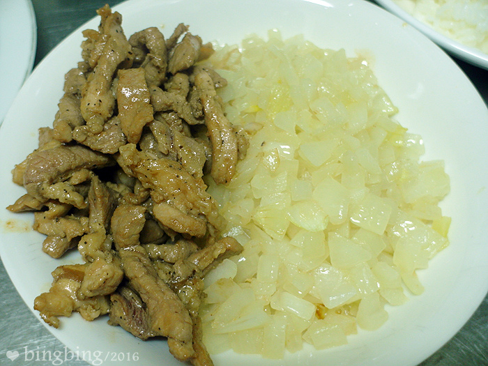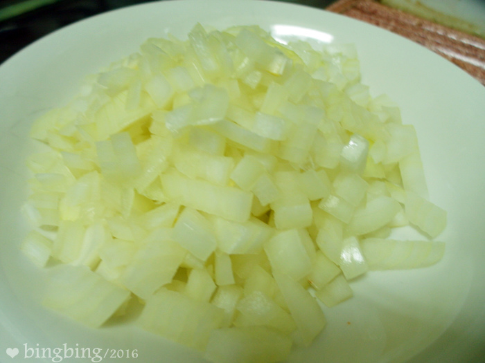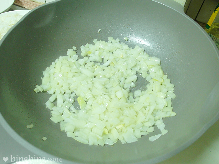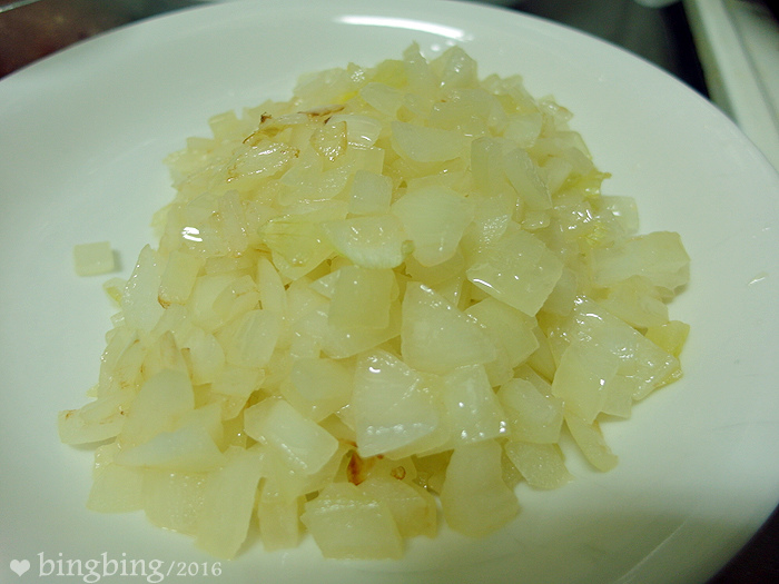 先將切丁後的洋蔥炒過,大概炒到熟透就先起鍋放旁邊