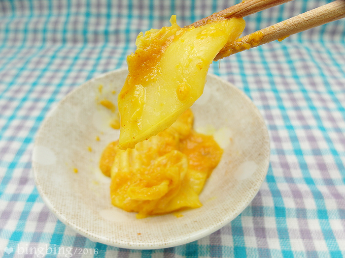 第一次吃到薑黃口味的泡菜,市面上好像也沒看過使用薑黃來做泡菜的,覺得好特別喔~
