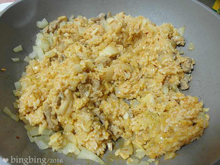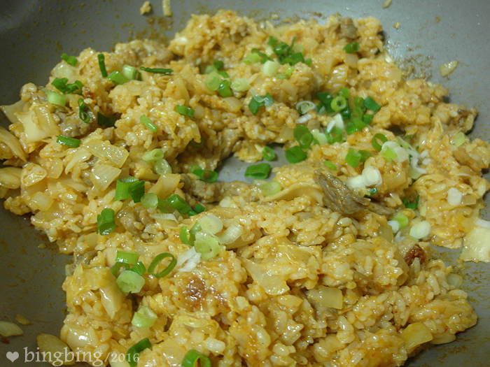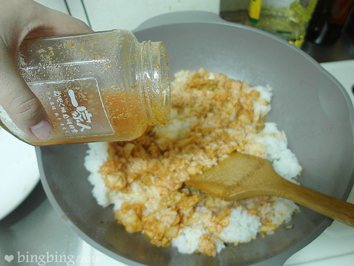 接著一樣同鍋把『手作果釀泡菜』和飯一起炒過,醬汁也不能浪費,所以我有加一點白開水在裡頭