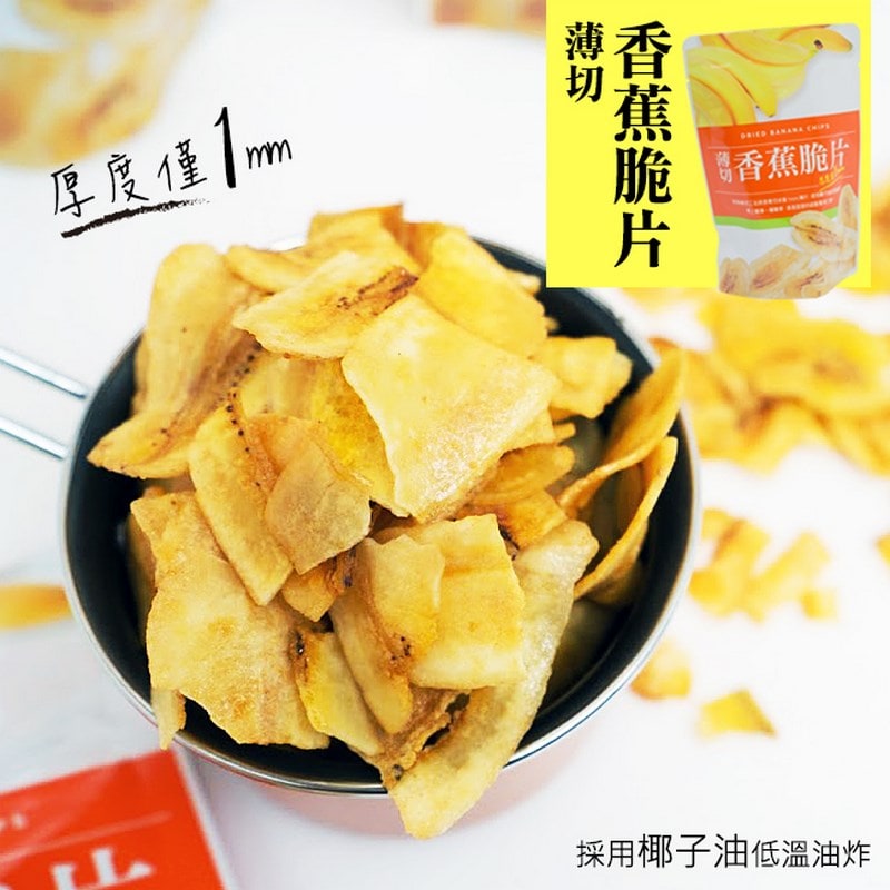 薄切香蕉脆片使用非基改香蕉,椰子油低溫油炸再裹上薄薄糖漿,