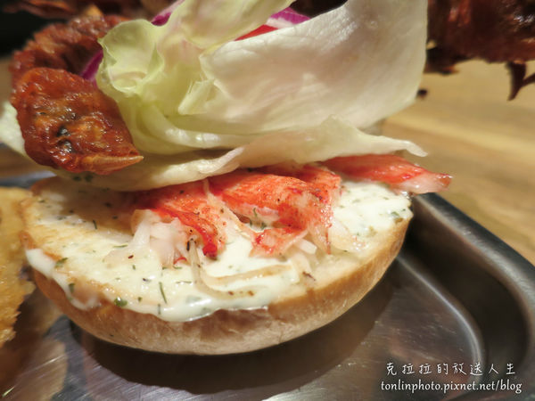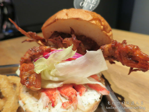 烤得香軟的漢堡包先鋪上了一層蟹肉,鋪疊上滿滿的生菜、番茄、洋蔥後,直接擺上一隻超大隻的酥炸軟殼蟹,