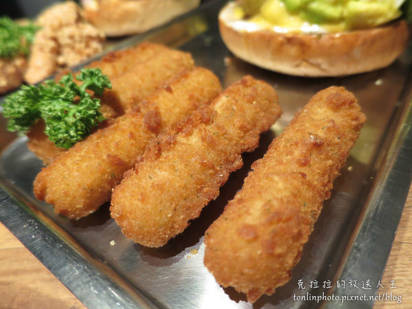 一旁搭配的馬茲瑞拉起司條炸得火候正好,
