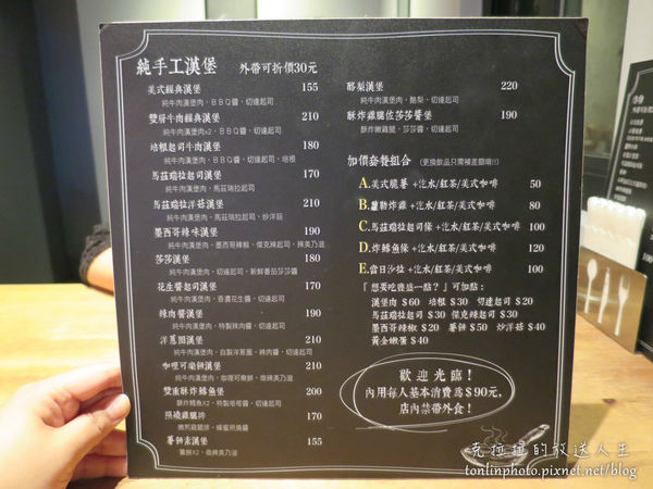 目前 Take Out 有16種漢堡(另外還有新品不定期發表喔),5種套餐組合可以選擇。
