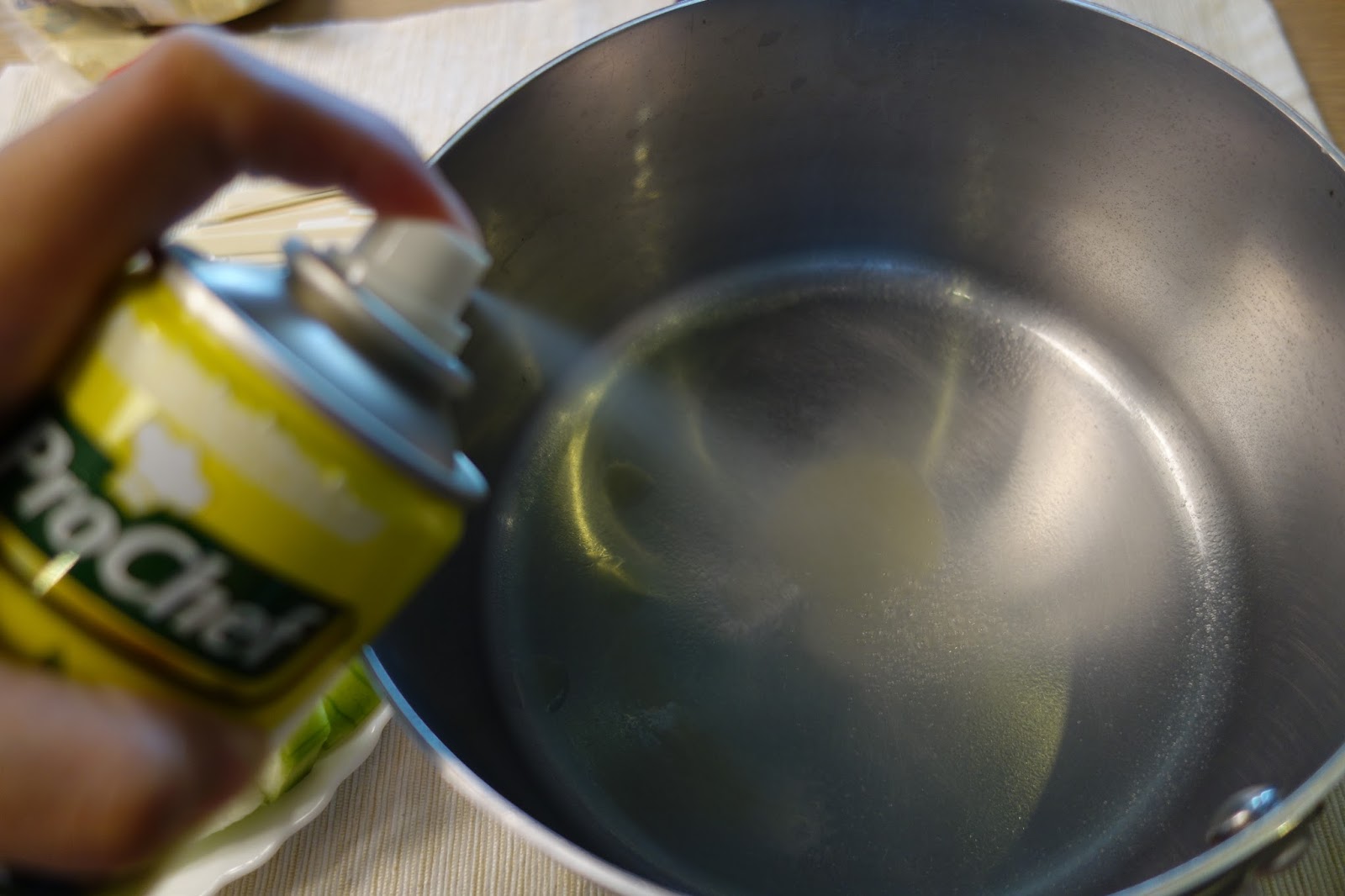 先在不鏽鋼湯鍋裡噴上一層『淡香特極初榨橄欖噴噴油』,再開火