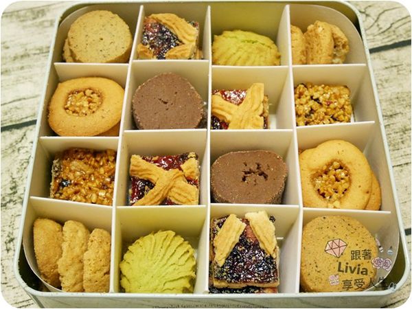 裡面16宮格餅乾有包含蔓越苺雪球、焦糖杏仁餅、草苺果醬 、藍苺果醬 、