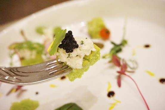 青豆慕斯口感綿密,搭配鮮甜的鱈場蟹沙拉,再佐上有特殊香氣高貴的魚子醬,整個好好吃,一點都無違和感啊!