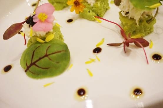 鱈場蟹沙拉和青豆慕斯上也點綴鮮豔的花朵,讓人捨不得下手啊!