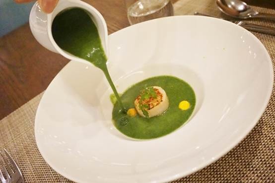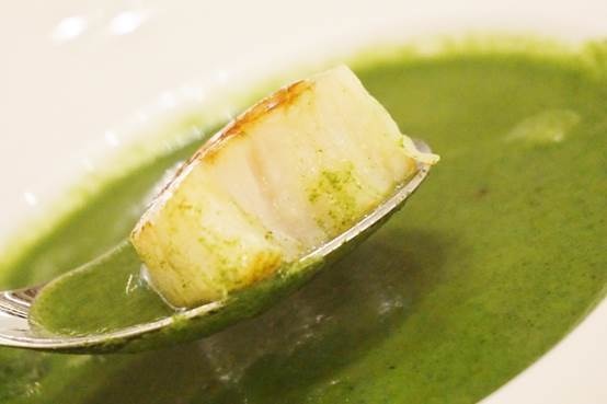 綠油油的濃湯中間,擺著一個令人想大口咬下的生食級大干貝啊!