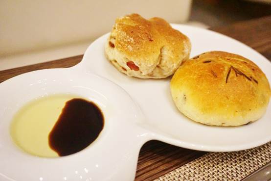 兩款小麵包配上橄欖油及紅酒醋。