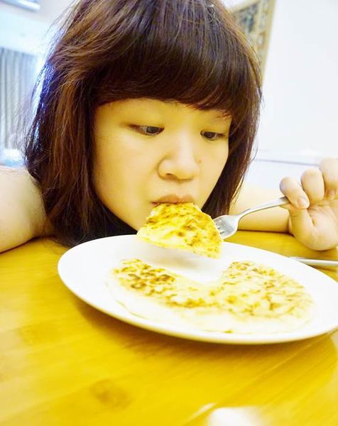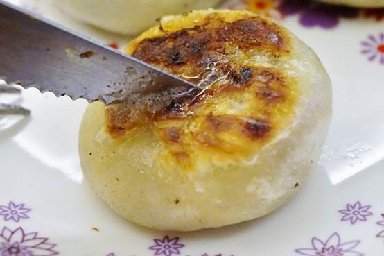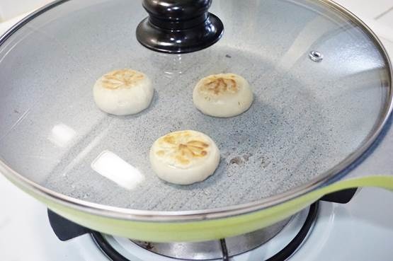 同樣兩面薄油煎至金黃,卡士達奶油酥餅會澎起來,敲口愛。