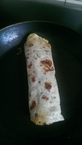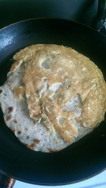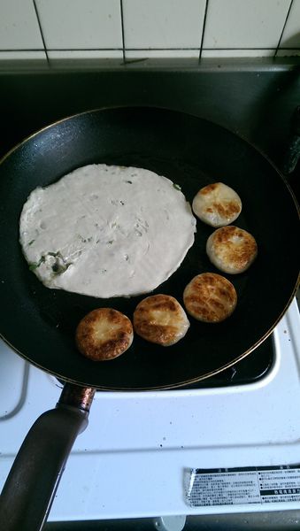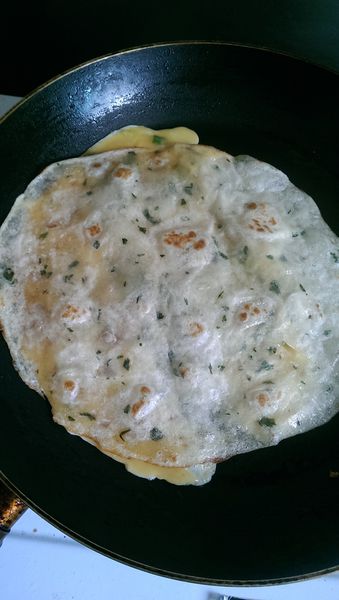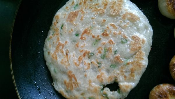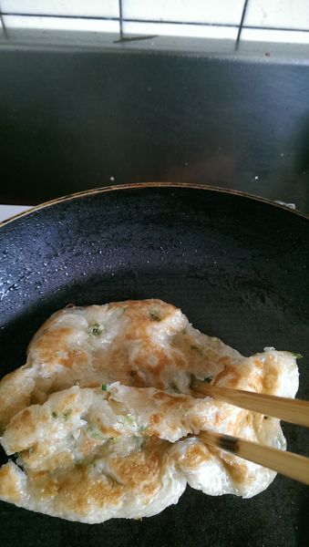 煎第二面的同時,把蔥抓餅一起放入