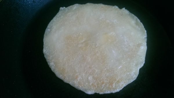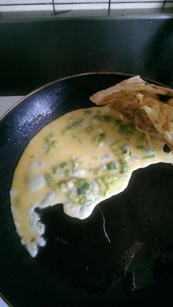 待蛋液不再流動後,就可以翻面再煎另一面,一下下就可以開始捲搂