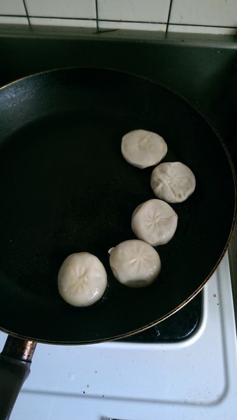 由稍熱以後,放入四顆很像小籠包的豬肉餡餅,