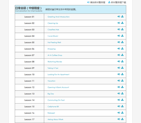 教材內容之豐富只能讓蟻爸用目瞪口呆來形容。就拿基本的日常會話來說,大概就有70篇教材可以選擇,有最基本的Greeting and introduction,或是搭車Take a taxi, vacation...etc. 大部分除了PDF可供下載之外,還有錄音檔也可以下載到電腦反覆聽呢!