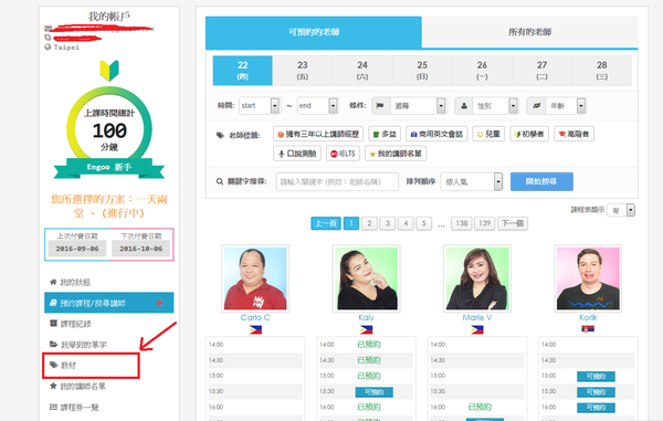在這裡可以選擇自己想要的上課方式,也可以決定自己想要的教材。教材的種類有百百種,Engoo在網站上有準備很多琳琅滿目的教材,可以在上課前先挑好然後告訴老師,今天我想要上什麼。如果不指定的話,通常老師也會幫忙選擇一篇她認為最適合的教材來上課。蟻爸認為這真的是很棒的一個設計。在之前上過的另外一個平台,教材,老師都是要到上課前10分鐘才知道要上什麼,然後利用那短短的10分鐘先預習......有一次蟻爸竟然還上到氣象啊什麼的課程.....當時心想,靠,我是能跟誰聊什麼大氣學嗎... Orz