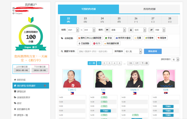 點選預約新課程之後,就可以進入到老師的搜尋頁面,在這邊可以自由選擇覺得符合自己需求的老師,以及時段,最後點下預約就可以囉。