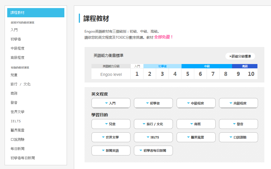 (engoo有眾多且豐富的教材,而且還很細心的分等級)