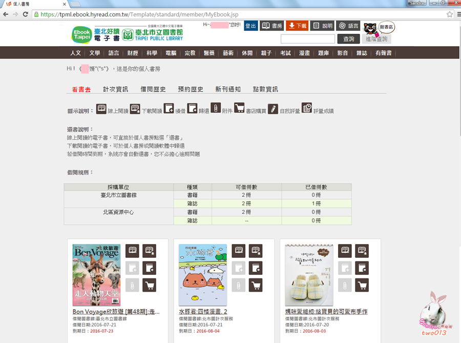 在﹝我的書櫃﹞裡,會顯示所有已借閱以及系統推薦的書籍