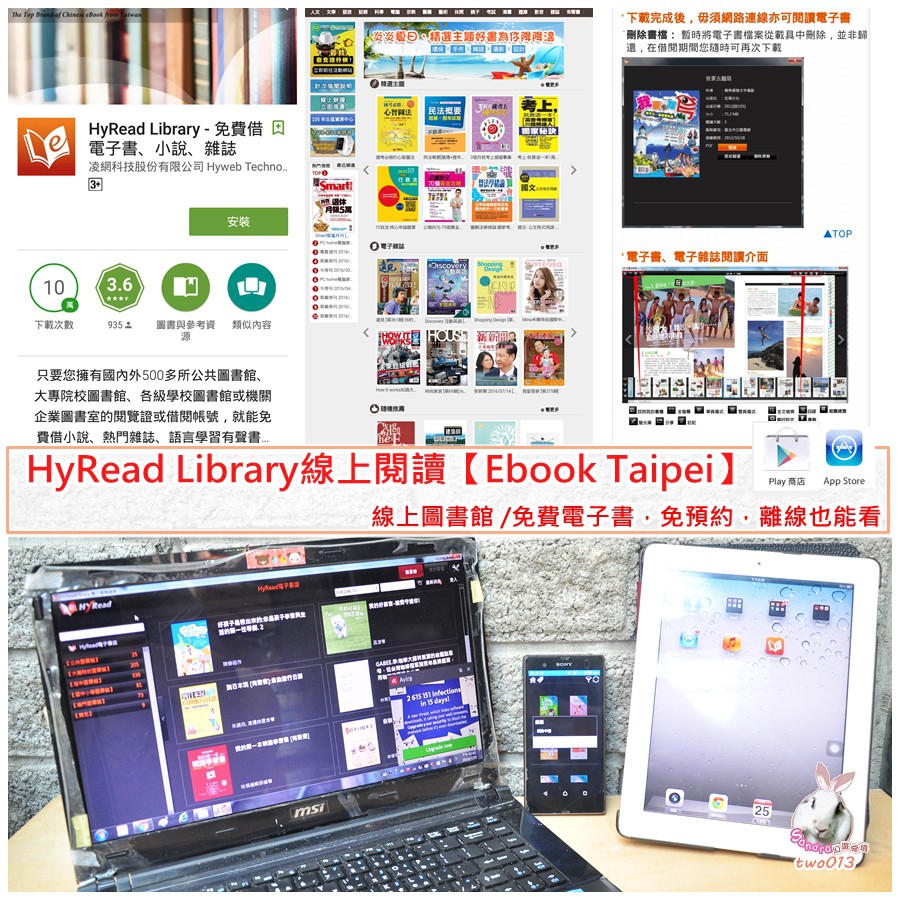 借閱後可於PC、手機、平板電腦中使用,搭配APP「HyRead Library」可以 離線閱讀
