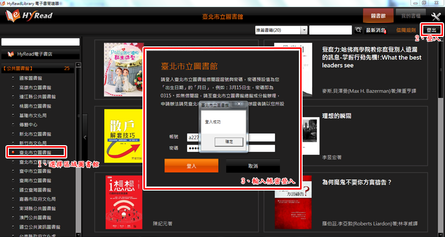 市立圖書館証號 ●帳號:身分證字號 ●密碼:出生日期四碼「月日」例如0726