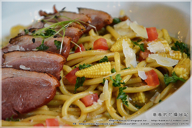 我點的主餐是『煙燻鴨胸搭配微辣咖哩醬汁鮮蔬義大利麵』。