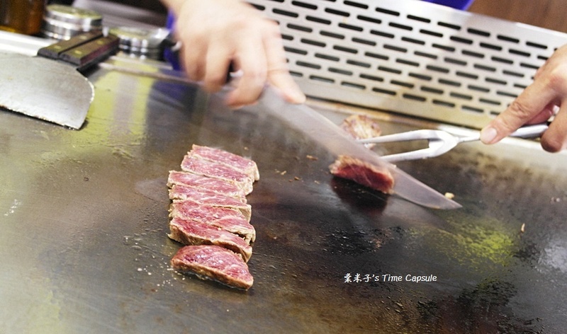 在鐵板上劈哩啪啦作響的是珍貴的松阪豬肉片,