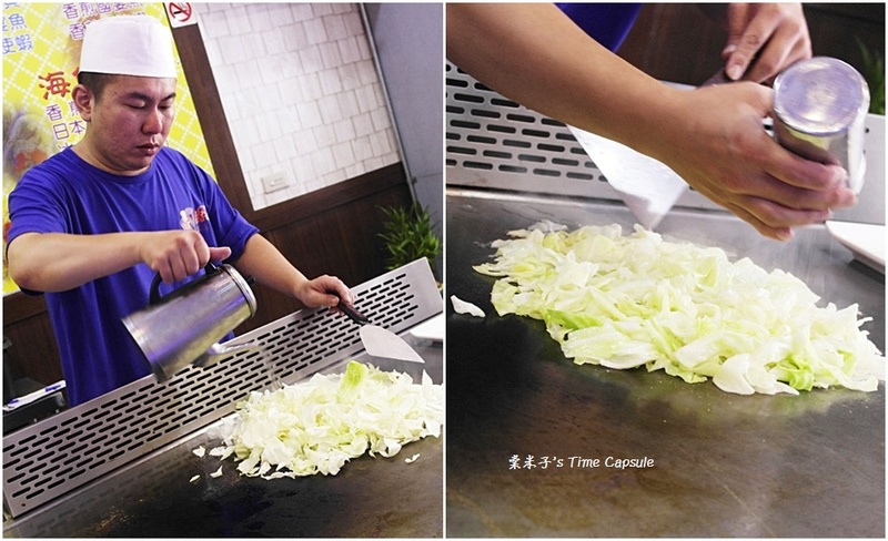 4人份的高麗菜和豆芽菜一起在鐵板上翻炒著,