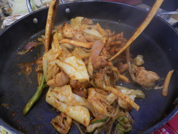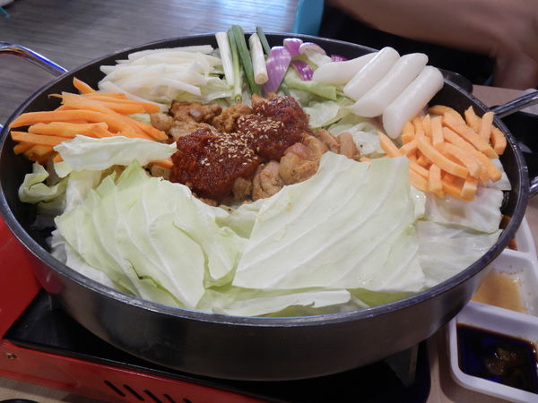 白飯 2碗 Double起司招牌雙人炒雞鍋 1鍋 釜山霸王海鮮盆 1盆 韓國炸雞 1份 芒果冰沙 1大杯