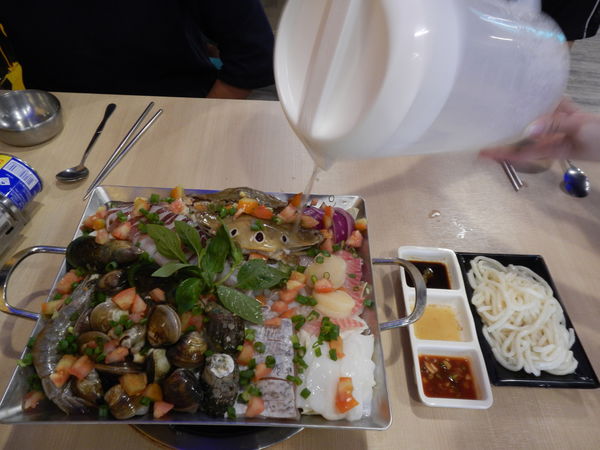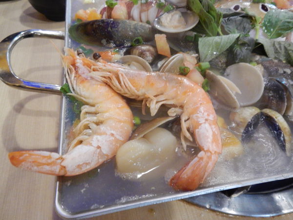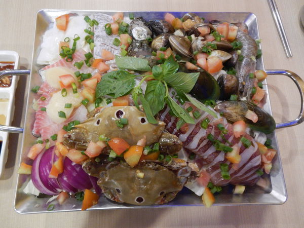 內有三點蟹、透抽、干貝、蝦子、九孔、蛤蜊、台灣鯛、等超多海鮮