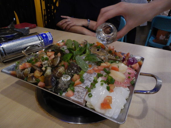 首先工作人員會替這海鮮盆淋上酒去海鮮腥味