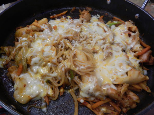 聽到第二次鈴聲後轉小火加入Q麵拌炒、撒上起士後蓋上木蓋等